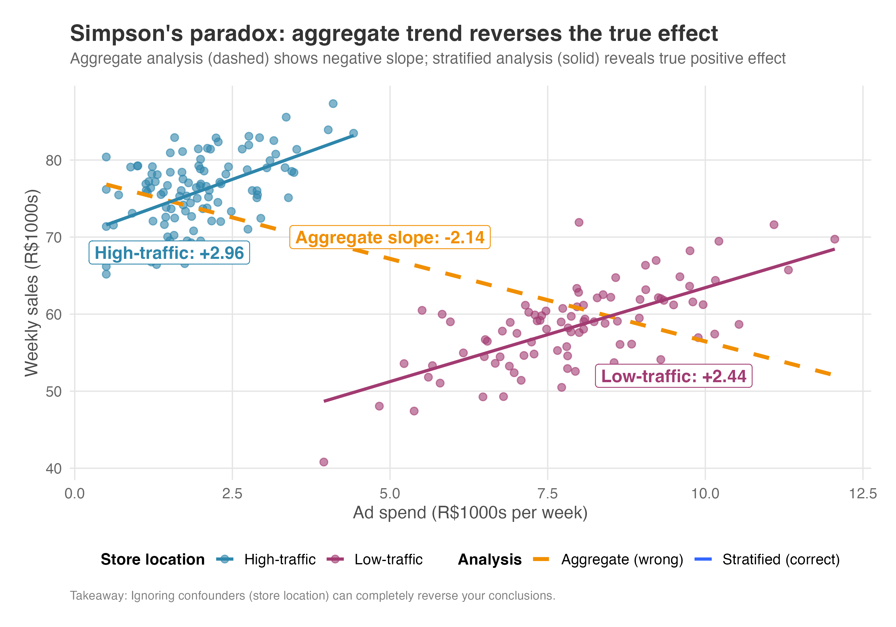 Within those groups, the treatment becomes “as if random” — a property called conditional independence, which we’ll formalize later. For a dramatic example of what happens when we fail to condition on a confounder, see Figure 6.11 illustrating the Simpson’s Paradox in the appendix: ignoring a confounder can actually reverse the direction of an effect.