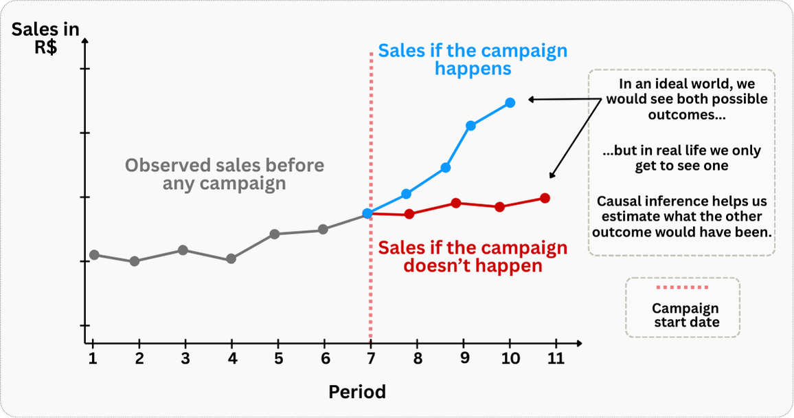 Of course, this exercise is purely hypothetical, but it illustrates a key insight: if we could somehow observe both potential outcomes for the same unit, causal inference would be straightforward. We would simply calculate the difference between these two scenarios to determine the true causal effect of the campaign.
