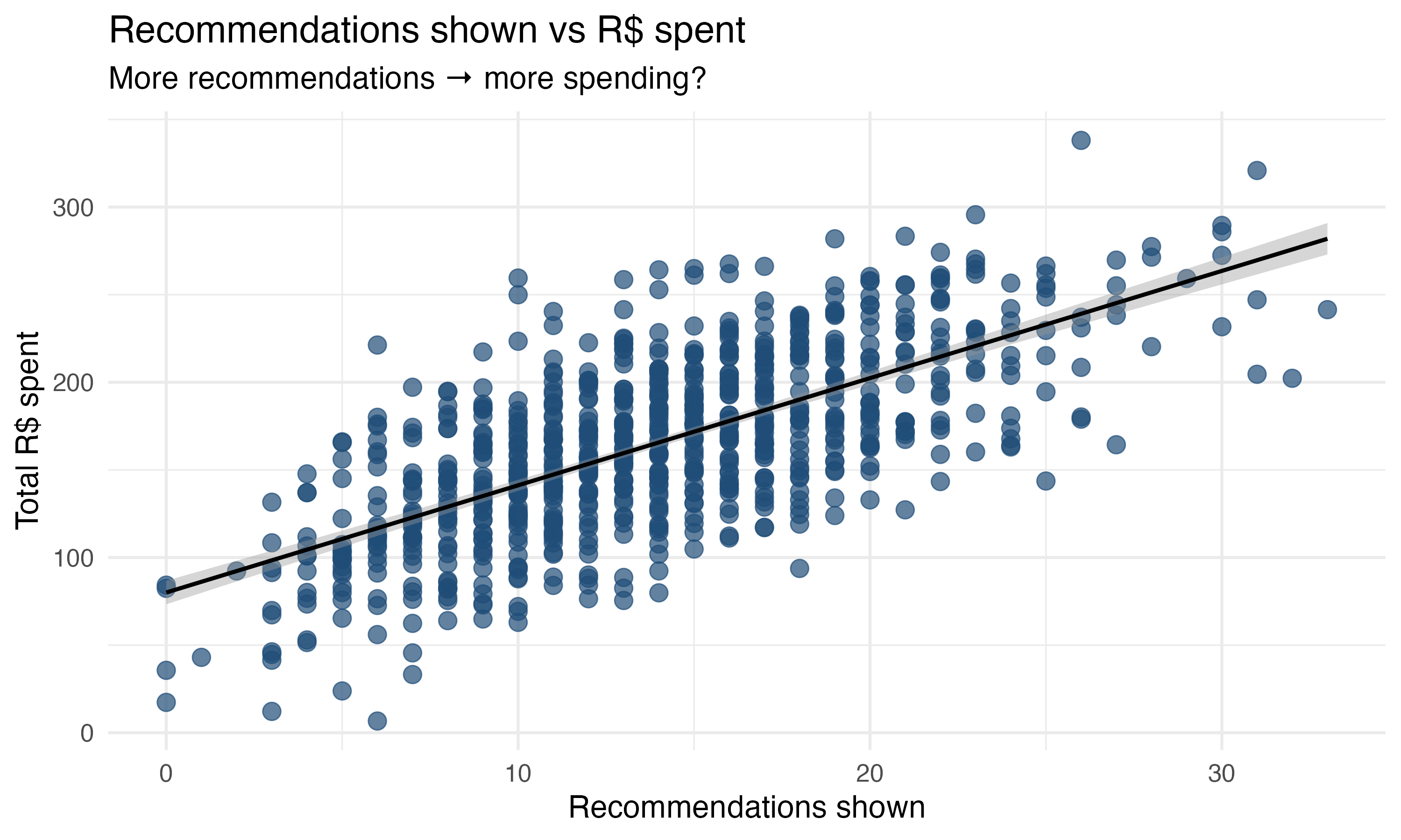 import statsmodels.formula.api as smf # Linear regressionNow let’s build an example that is more relatable to our daily lives. Your marketplace app launches a new recommendation system — an algorithm designed to suggest the most relevant items to each user based on their preferences. You notice the more recommendations suggested by this new recommendation system a user sees, the higher their total R$ spent in a session, as shown in Figure 2.1. Makes sense, right? With a good recommendation system, users are more likely to find what they are looking for and buy it.
