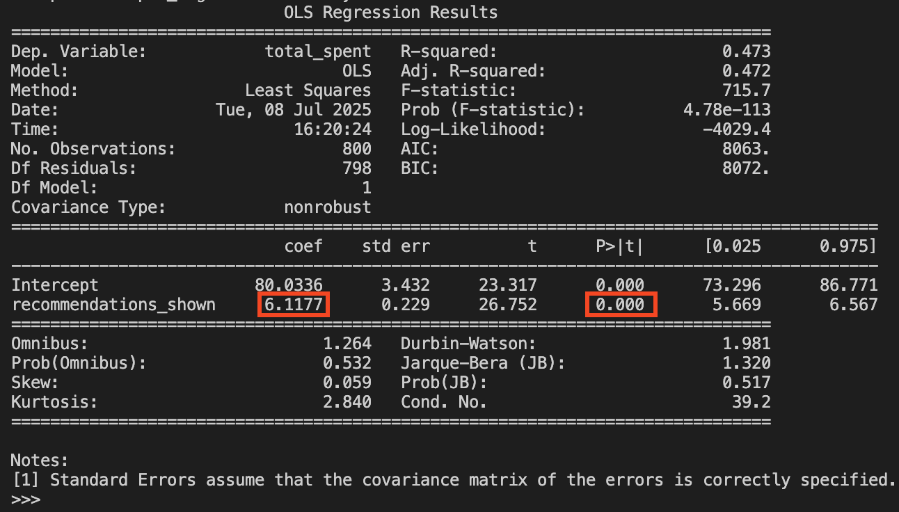 print(simple_regression.summary())We find that \(\hat{\beta_0}=80.03\) and \(\hat{\beta}_1 = 6.12\). The intercept \(\hat{\beta_0}\) suggests that a user shown zero recommendations is expected to spend R$80.03 on average. As for \(\hat{\beta}_1\), it tells us that for every additional recommendation shown, the user spends on average R$6.12 more, a result that is statistically significant at the 1% level. This makes a lot of sense, right? The more we show users recommendations, the more they spend. With the former being the cause for the latter.