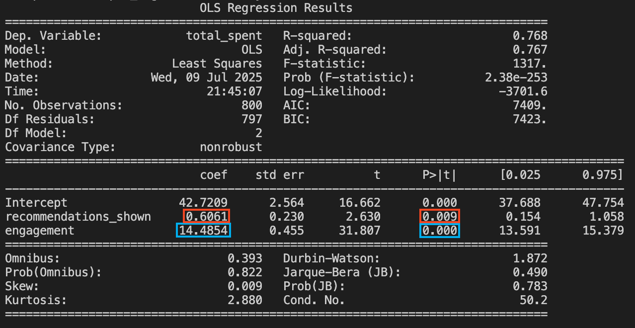 multiple_regression = smf.ols('total_spent ~ recommendations_shown + engagement', data=df).fit()