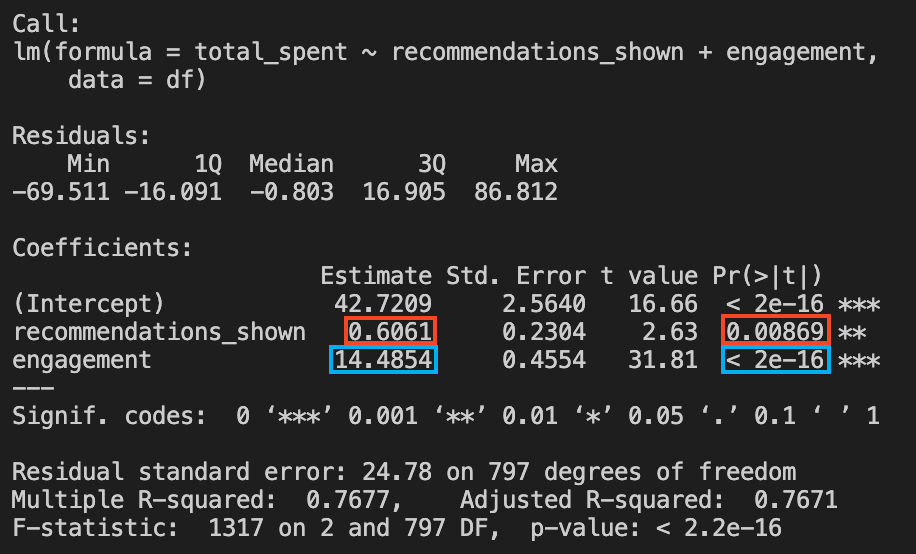 multiple_regression <- lm(total_spent ~ recommendations_shown + engagement, data = df)