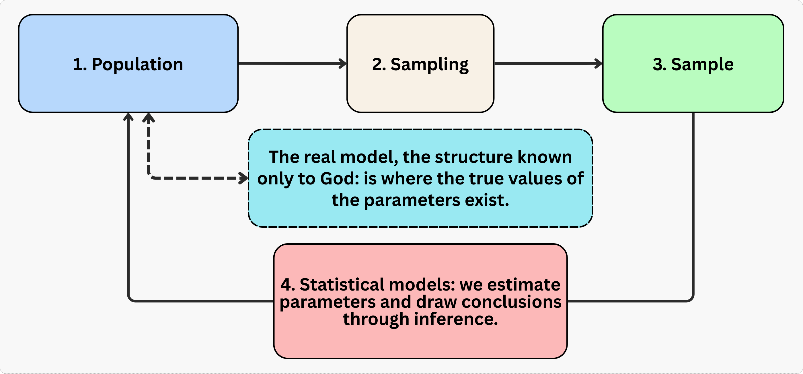 We’ll also use the Figure 1.1 below to walk through the grand scheme of things when doing inference — the mental map behind how we go from data to answers.