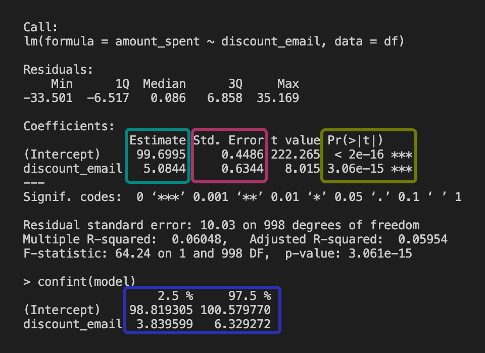 So, don’t worry about a low \(R^2\) if your focus is on understanding the impact of a specific intervention. It just means there is a lot of unexplained noise in the individual outcomes — which is typical in human behavior — but it doesn’t invalidate your causal finding.
