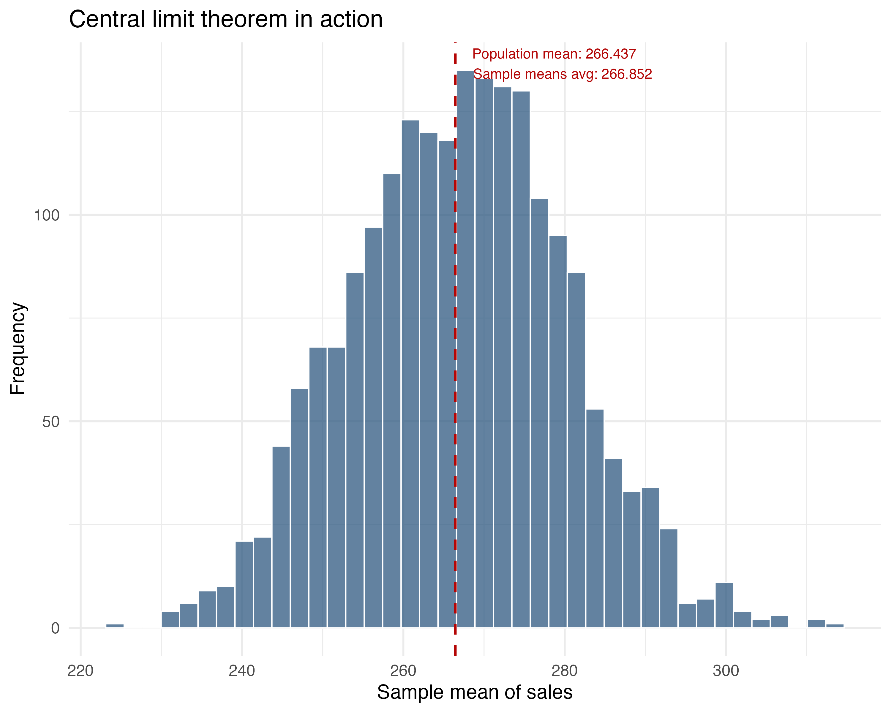 print(mean_sales) # R$266.44In practice, when you calculate the average engagement across users, you’re estimating the expected value (mean) of engagement in the population. In other words, you are estimating the population mean.