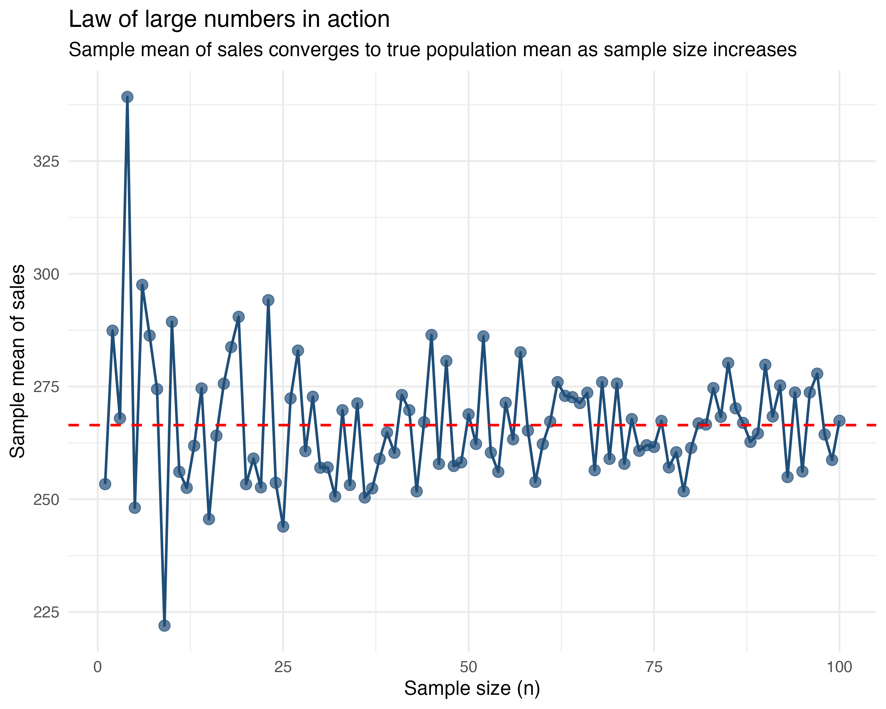 Let’s say you’re trying to estimate average sales. If you only look at 5 customers, you might get a fluke—maybe it’s all holiday shoppers. But if you look at 1,000 customers, that weirdness averages out. Your sample mean converges to the population mean.