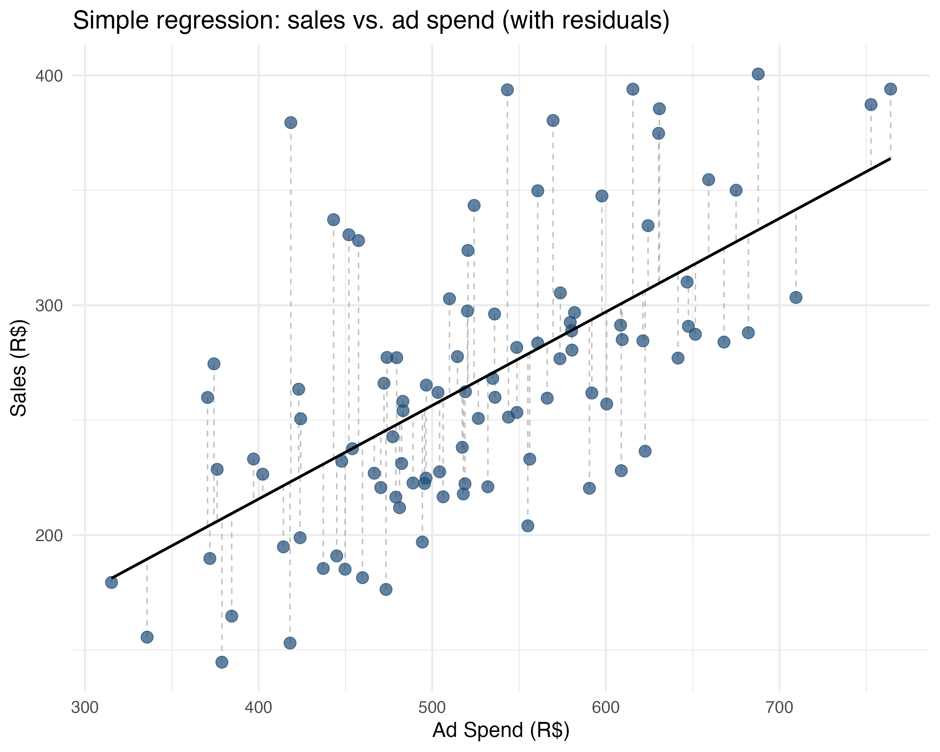 sales = 52.88 + 0.41 * ad_spendSlope (\(\beta_1\)): “Every R$1 increase in ads is associated with R$0.41 more sales”.