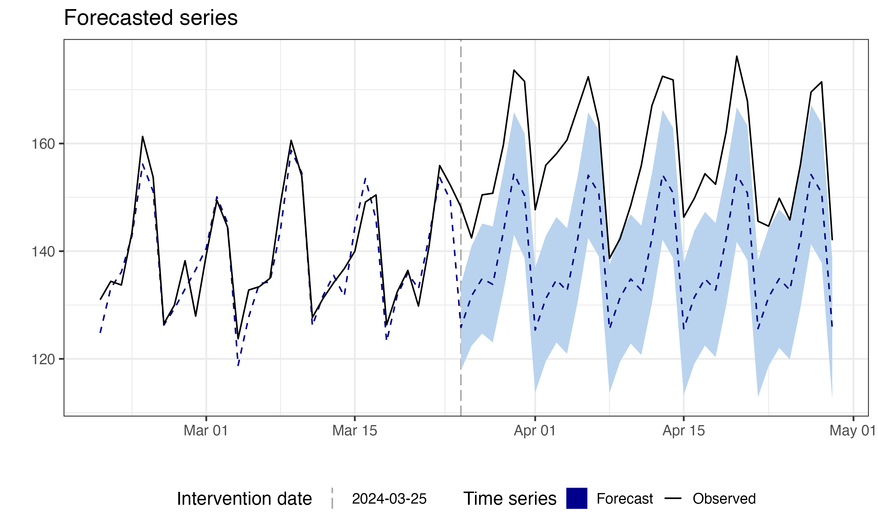 Python’s auto ARIMA may select a different but equivalent specification — e.g., ARIMA(0,0,2)(1,0,2)[7] — because the search strategies and information criteria differ across implementations. Both converge on similar effect estimates, which is itself a robustness check.↩︎