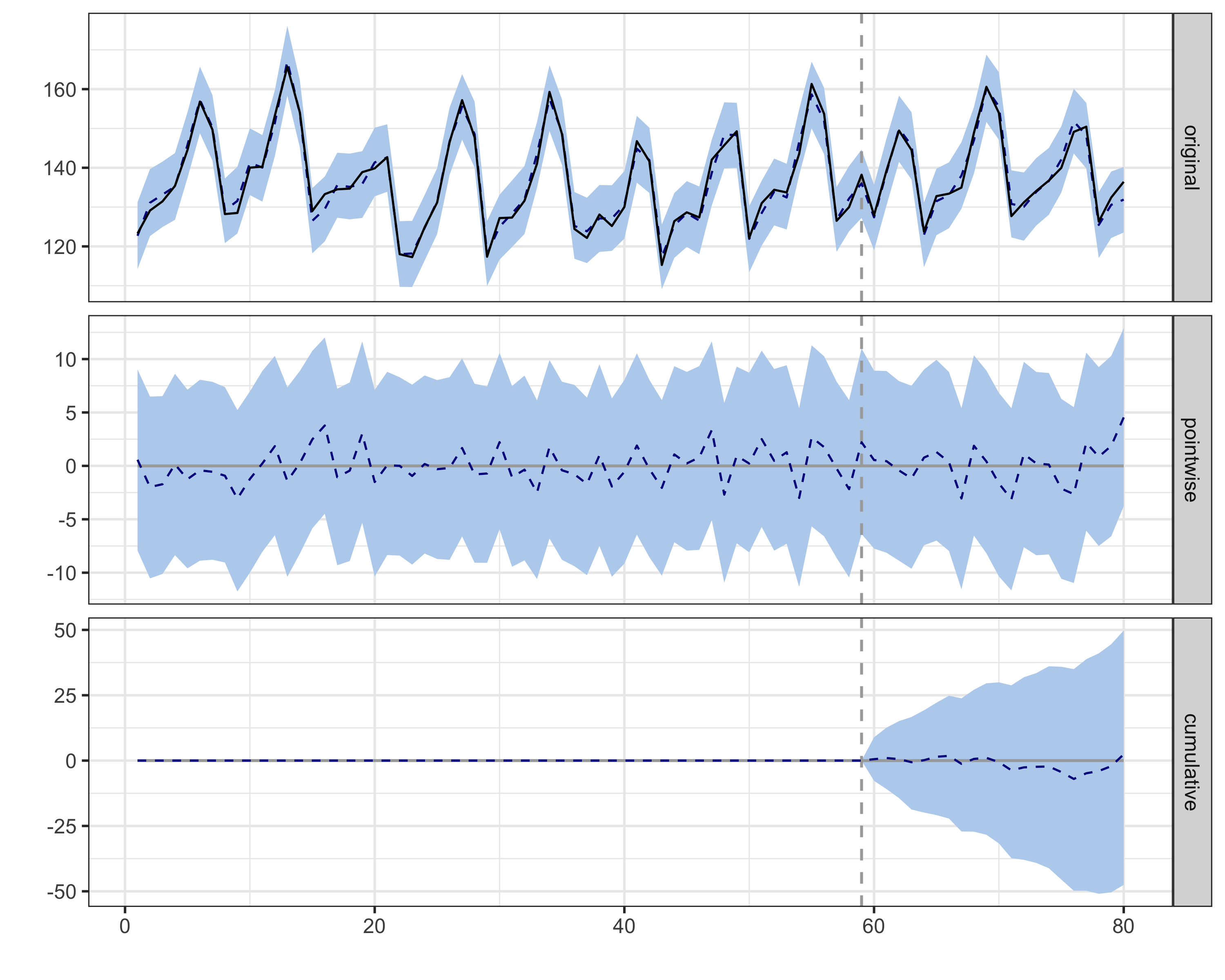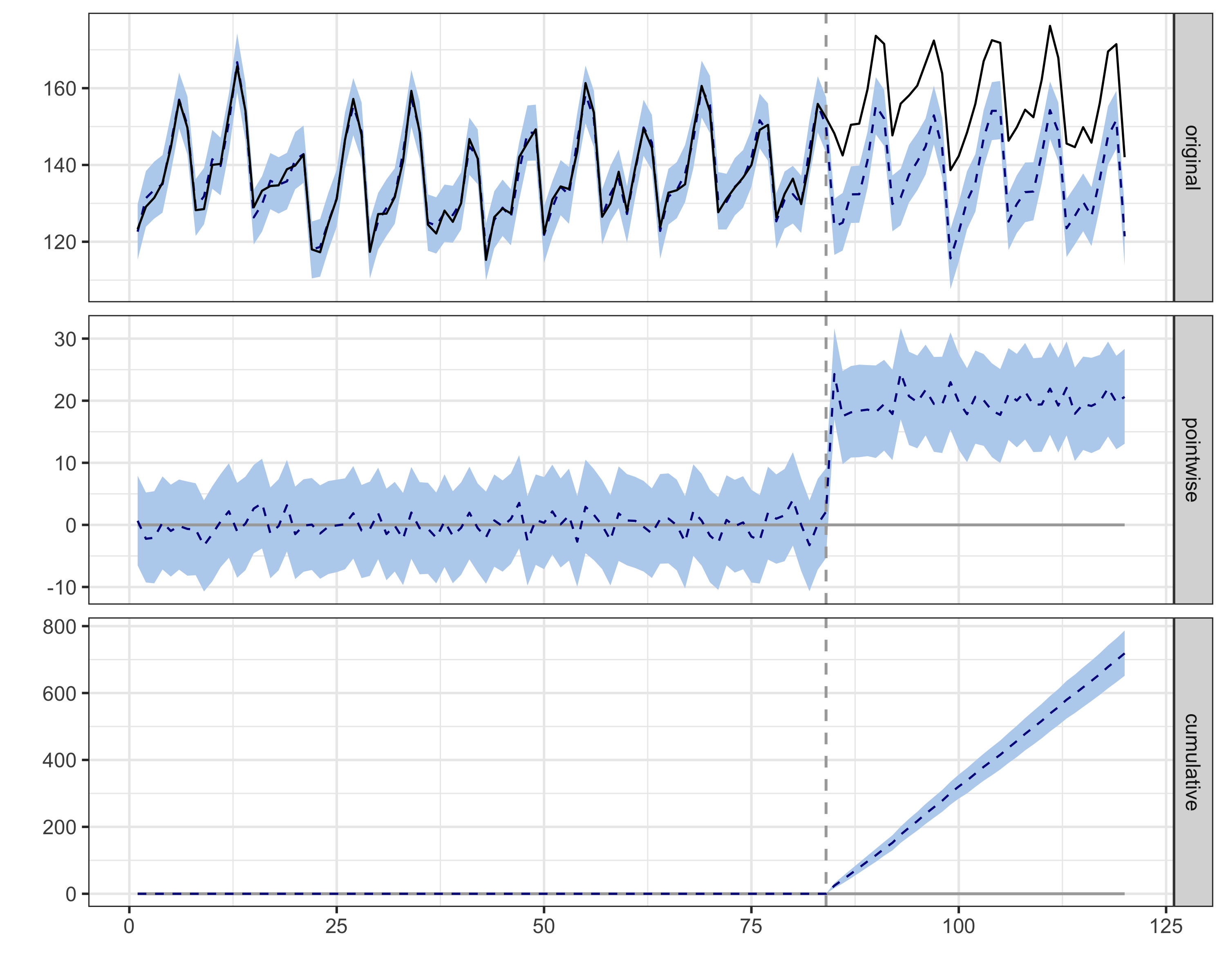 \[ \widehat{\mathrm{impact}}_t = \text{Observed outcome}_{t} - \text{Predicted outcome}_{t} \tag{11.2}\]