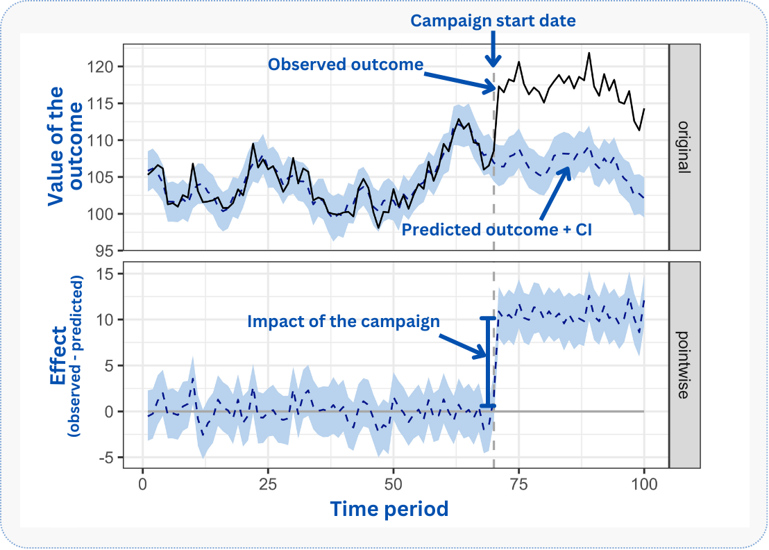 In Figure 11.2, focus on the top panel: notice how closely the counterfactual (blue) tracks the observed (black) before the intervention. This alignment is your sanity check, as the model should fit the pre-period well. After the intervention, the gap that opens up is your estimated lift. The bottom panel isolates this gap, showing magnitude and statistical significance (does the confidence band exclude zero?).