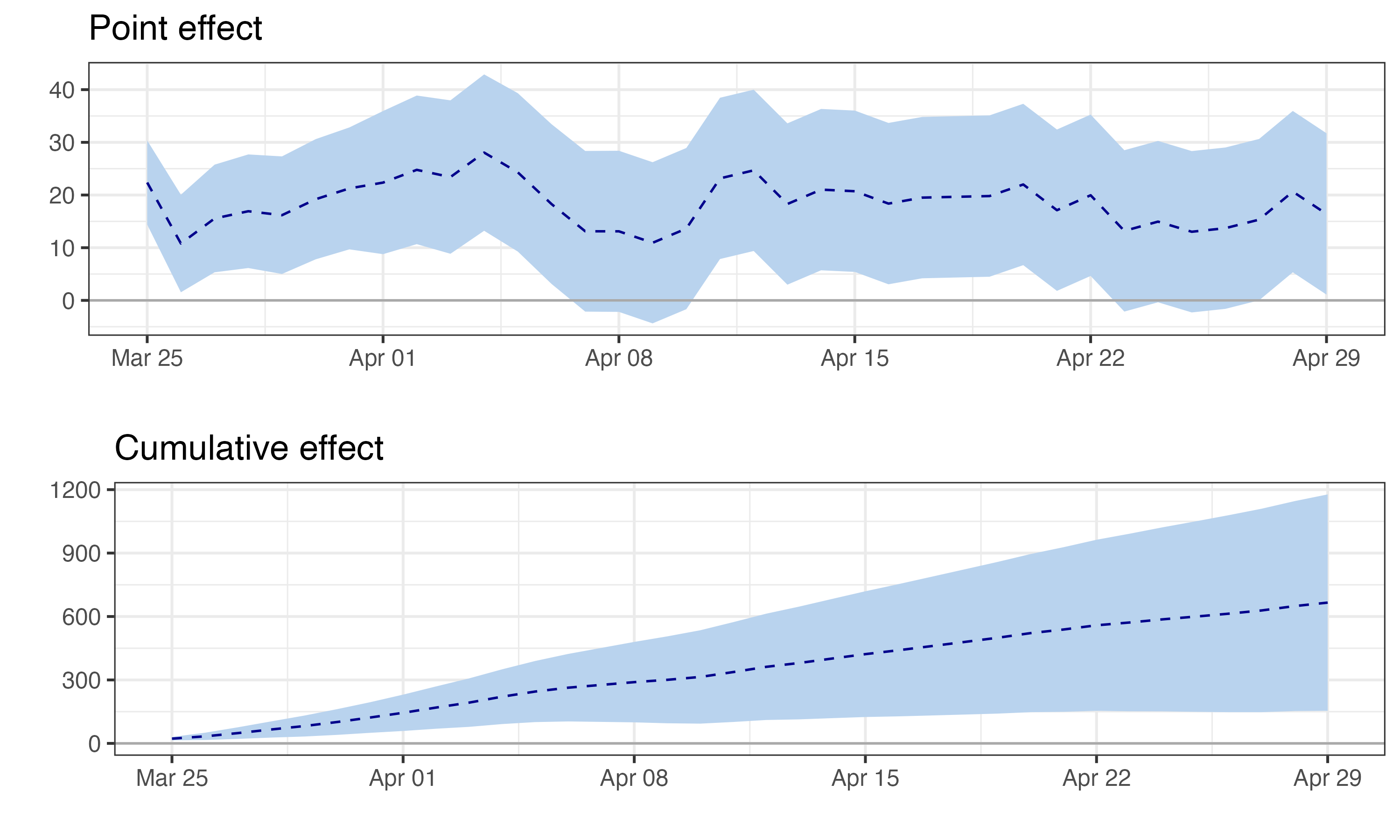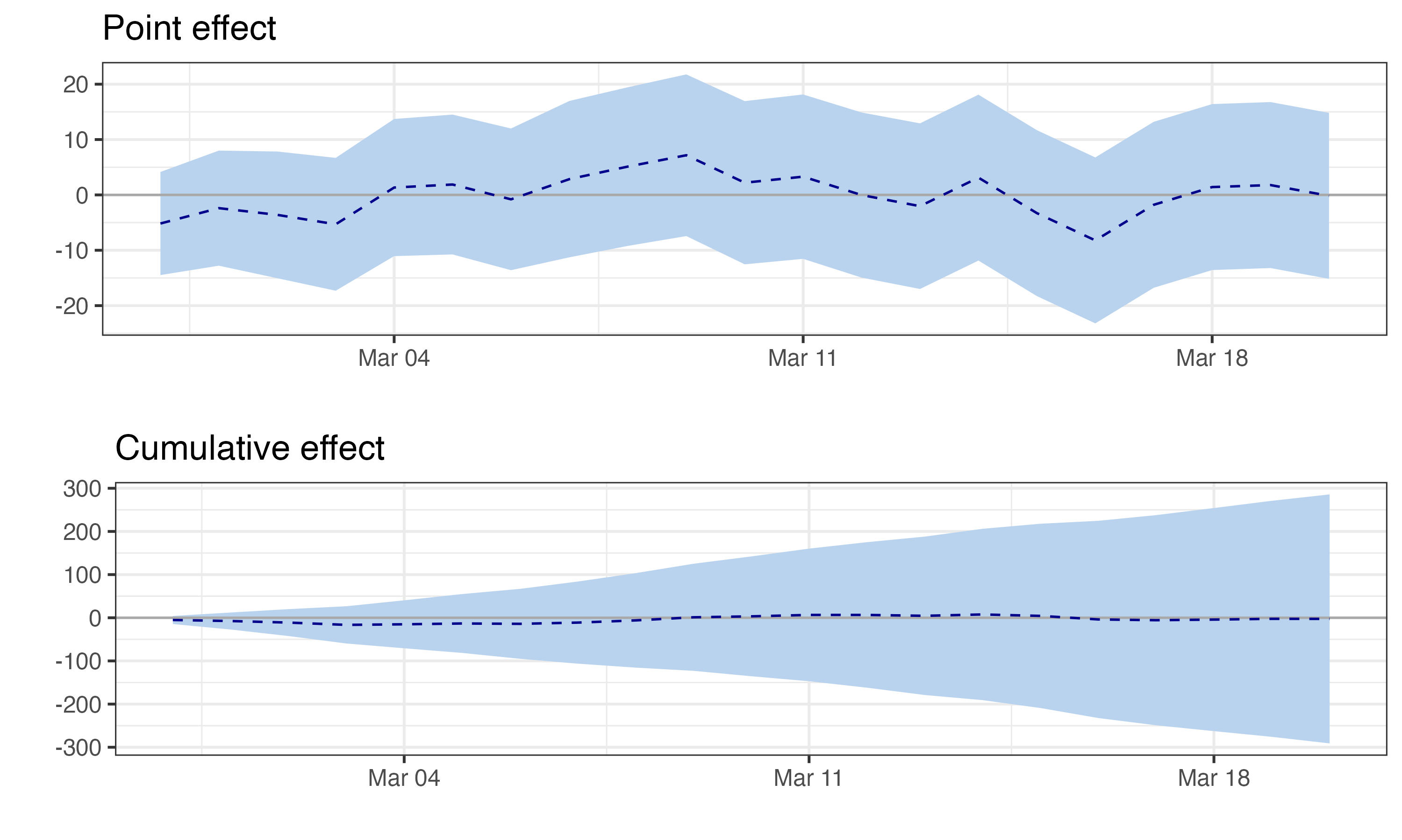 Recall from our earlier discussion that cumulative effects are only meaningful for flow metrics like daily sales — quantities measured over an interval. For stock metrics (like total active users), summing daily values double-counts and produces nonsense; report the point effect or temporal average instead (Brodersen et al. 2015).↩︎