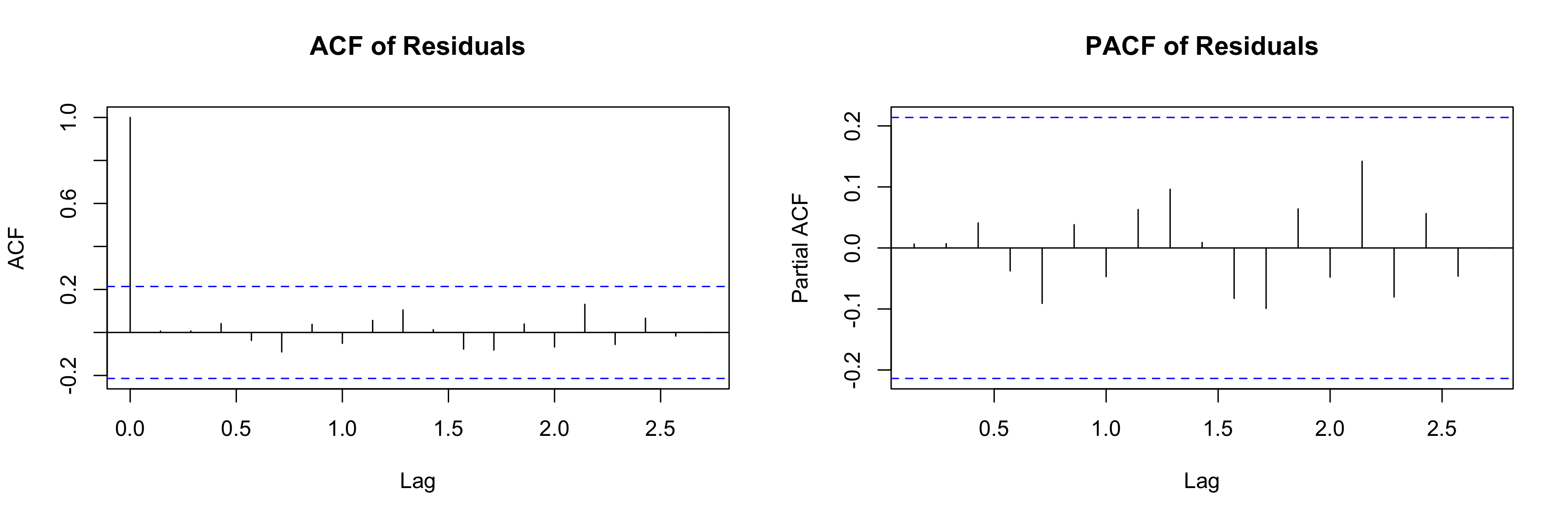 The R and Python p-values differ because each implementation’s auto ARIMA may select a different model specification (e.g., AR vs. MA terms), producing different residual series — both are valid diagnostic residuals for checking model adequacy.↩︎